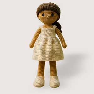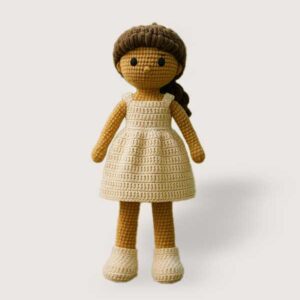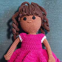 Handmade crocheted doll with hair, coloured dress and matching shoes