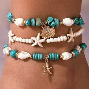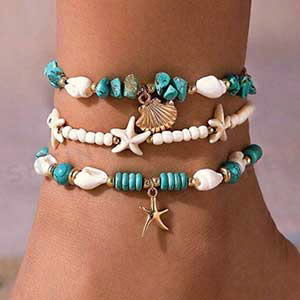 Stack of three Bohemian-style anklet evoking costal or beachy vibe
