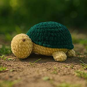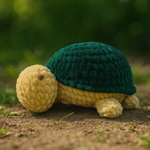 Small crocheted turtle crafted to form a slightly raised hexagonal pattern giving it a realistic yet whimsical appearance