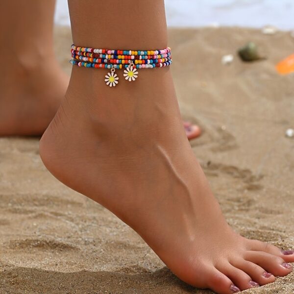 Consists of multiple strands of small, vibrant beads in different shades creating a bohemian multicoloured pattern. Two delicate white daisy shaped charms with yellow centers dangle from the centre adding a whimsical touch.