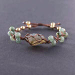 Irregularly shaped pendant encased in a woven cagelike structure. Flanking the pendant on both sides are clusters of small, round, pale green beads interspersed with metallic gold-toned accents. Overall, it is suitable for stacking or everyday wear, with a focus on natural materials and subtle sparkle.