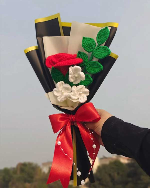 The Bouquet consist of several crafted flowers and green leaves, all wrapped in a combination of black and beige paper with yellow trim for an elegant touch.