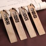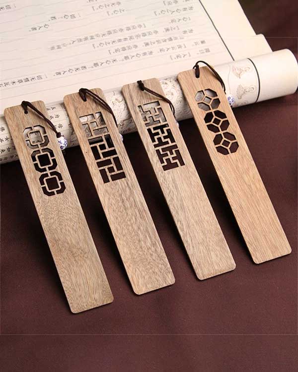 The bookmark intricate cutout designs in a minimalist, geometric style including interlocking chain motif, angular waves, hexagonal honeycomb design, complex knotwork suggesting celtic or eastern ornamental influences, creating a serene, artisanal aesthetic that blends craftsmanship with historical elegance.