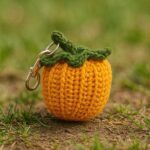 The pumpkin is crafted from bright orange yarn, with a textured tight knit pattern that gives it a rounded , plump shape. The green crocheted stem gives a realistic appearance and has a silve key ring with a clasp