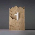 It features a vertical wooden panel with a natural, light brown grain finish. The top of the panel is shaped with a series of jagged mountain like peaks, adding a distinctive and artistic flair